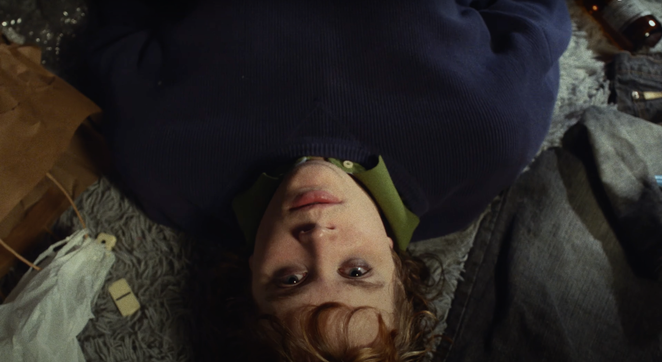 A young person with curly hair sitting on a bed in a dimly lit room, with a brick wall and cluttered surroundings including clothes, bottles, a skateboard, and a bedside table with various items.